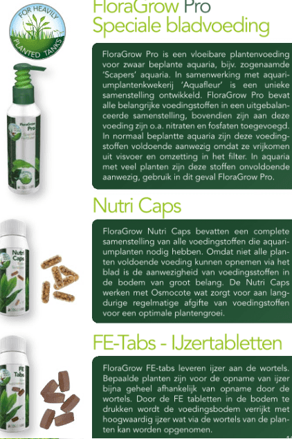FloraGrow Pro bevat alle belangrijke voedingstoffen in een uitgebalanceerde samenstelling, bovendien zijn aan deze voeding zijn o.a. nitraten en fosfaten toegevoegd. Frits Kuiper Groningen adviseert om eerst uw water te (laten) testen voordat u Colombo Flora Gro Pro gaat gebruiken. De Flora Gro Pro bevat naast de verschillende micro spoorelementen ook nitraten en fosfaten, welke essentieel zijn voor een goede plantengroei. Heeft u een al wat ouder aquarium dan is de kans groot dat dit aquarium voldoende nitraten en fosfaten al aanwezig zijn. In dat geval kan u beter gebruik maken van de Colombo Flora Gro.