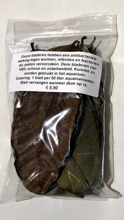 Naast een mooie aanvulling in je aquarium en ook heel nuttig, Guave bladeren. Guave bladeren hebben een antibacteriële werking tegen wormen, infecties en bacteriën die ziektes veroorzaken.