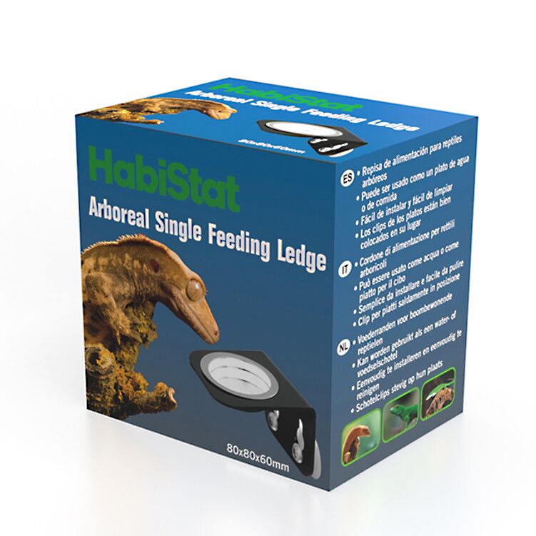 Heb je reptiel die veel in bomen zit (boombewonende reptielen) en je wilt deze op een veilige en redelijk natuurlijke manier voeden en hydrateren? De Habistat feeding ledge is de ideale uitkomst. Plaats deze voerbak eenvoudig met zuignappen aan het glas van je terrarium op elke gewilde plaats en je mooie dieren kunnen met een veilig gevoel eten.