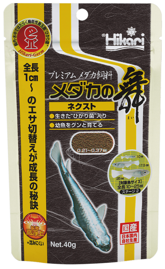 Hikari Medaka No Mai Next bevat “Hikari Germ” om de spijsvertering te ondersteunen zodat deze actief blijft in het darmkanaal en in het water. De Hikari Medaka No Mai Next korrels verspreiden zich snel over het oppervlak, zodat elke vis van het voedsel kan genieten.