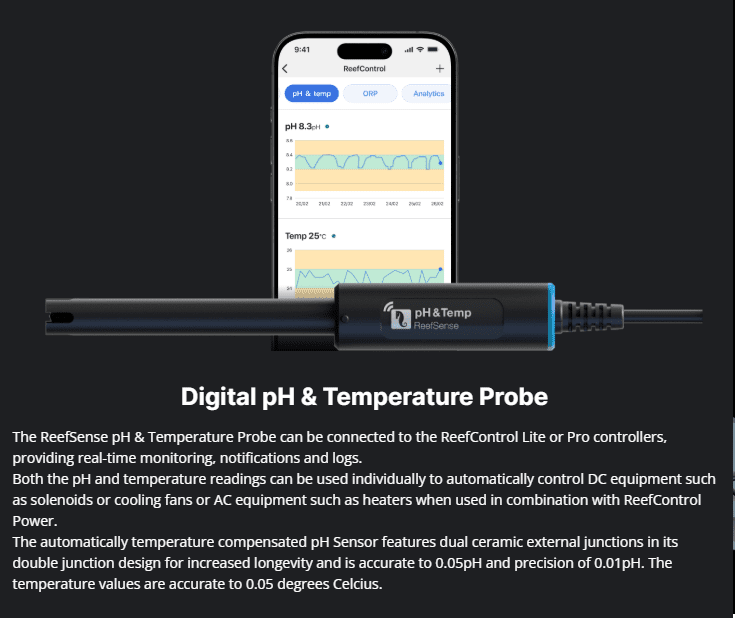 Net als alle systemen binnen de ReefControl-familie maakt ook de ReefControl Pro gebruik van digitale ReefSense-sondes. In de standaardset wordt een pH-sonde met geïntegreerde temperatuursensor meegeleverd. Deze combinatie zorgt ervoor dat pH-metingen automatisch worden gecorrigeerd voor temperatuurinvloeden, wat resulteert in zeer betrouwbare en consistente meetwaarden. Digitale sensoren hebben als groot voordeel dat ze minder storingsgevoelig zijn, nauwkeuriger meten en hun precisie beter behouden dan traditionele analoge sondes.