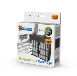 De Superfish Hang On filter cartridges bevatten een Dual-Action filtercartridge die bestaan uit Carbon Filterfoam en twee Micro-filtermatten (CrystalMax). De actieve kool in de Carbon Filterfoam absorbeert kleur- en giftige stoffen uit het water terwijl de pH waarde neutraal blijft.