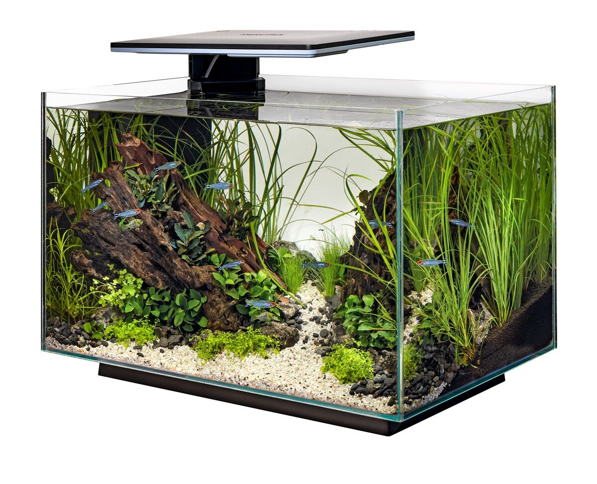 Een all-in aquarium die past in ieder interieur, wordt compleet met een filter, duurzame LED verlichting, een slim bekabelingssysteem en afdekruit die voorkomt dat vissen uit het aquarium springen.