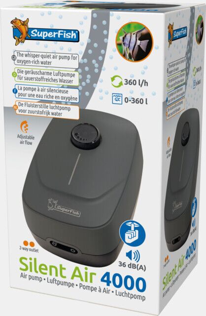 Dankzij de hoge capaciteit en dubbele uitgangen is de SuperFish Silent Air 4000 geschikt voor aquaria tot maar liefst 360 liter. Dit maakt de pomp een uitstekende keuze voor middelgrote tot grotere aquaria, of voor situaties waarin meerdere luchtuitgangen gewenst zijn. Of je nu een gezelschapsaquarium hebt met veel vissen, een garnalenbak met extra zuurstofbehoefte of een aquarium vol decoratieve bubbels, deze luchtpomp biedt de kracht en flexibiliteit die je nodig hebt.